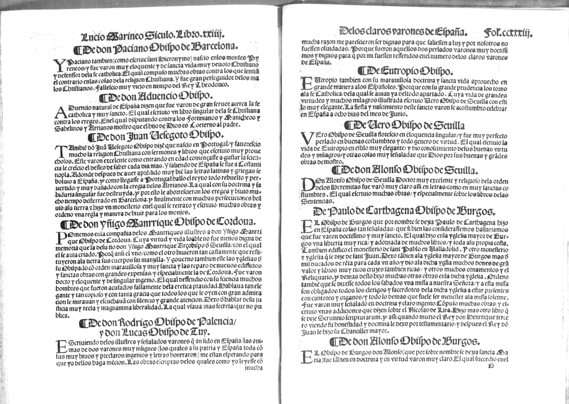 El Obispo de Burgos don Alonso (que por sobre nombre se dezía Sancta María) fue también en doctrina y en virtud varón muy claro. El qual succedió en el | [fol. 233v] Obispado de Burgos a don Paulo su padre, el qual avía nascido de legítimo matrimonio antes que su padre fuesse sacerdote. Este don Alonso desde su tierna edad se inclinó a las letras y vida religiosa y estudiando continuamente salió gran letrado assí en derechos como en otras facultades. Este siendo Deán de Santiago fue embiado por su Rey con otros Embaxadores al concilio de Basilea. Adonde por su gran doctrina y singular ingenio fue muy loado de todos y alcançó grandes loores y muy clara fama. Y dende buelto a Roma el Papa Eugenio le proveyó del Obispado, y dende adelante apartándose de los negocios del mundo començó a predicar muy sanctamente oyendo de buena voluntad a los penitentes y ayudando con mucha charidad a los pobres y edifficando nuevas iglesias. Fue enemigo de embidiosos y avarientos. Porque dezía que no podía gozar de sus bienes el que avía embidia de los agenos, y no solamente quería que su ánimo careciesse de vicios, mas que el cuerpo también fuesse muy limpio, y assí usava siempre mucha limpieza assí en las otras cosas, como en vestir y comer. Porque dezía que por la limpieza del cuerpo se podía conoscer la innocencia del ánimo. Assí que siendo de setenta años dexando muy clara fama se partió para la otra vida.